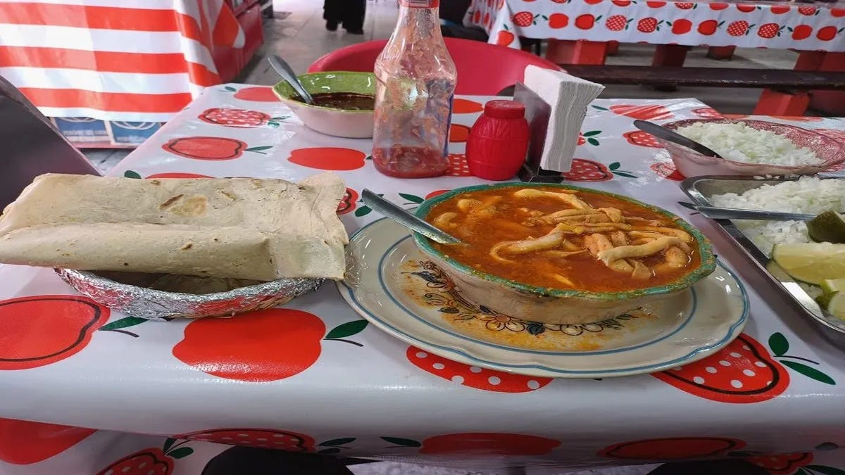 Mercado Pantaco in Mexico City and its communal tables. Huge dishes and giant tortillas. It is said that if you manage to finish twenty of those tortillas, the meal is free.